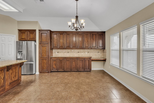 - The kitchen is spacious with plenty of cabinet space for storage.
