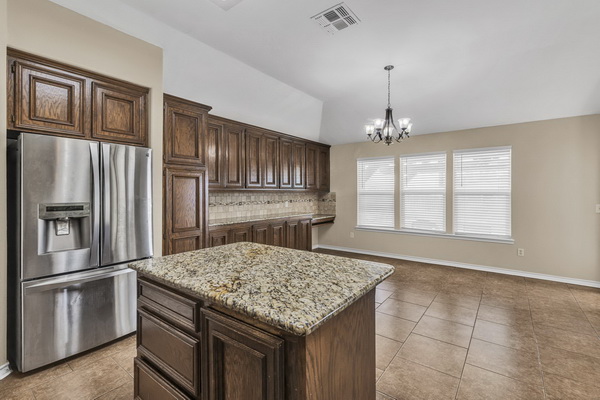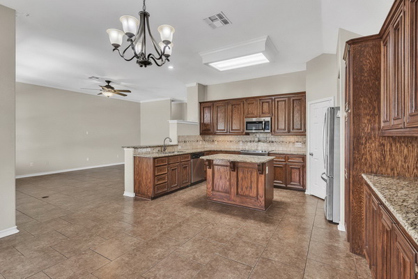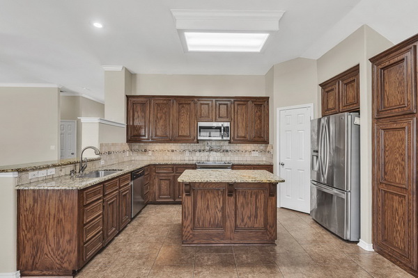 - Kitchen is well equipped with an island and stainless steel appliances.