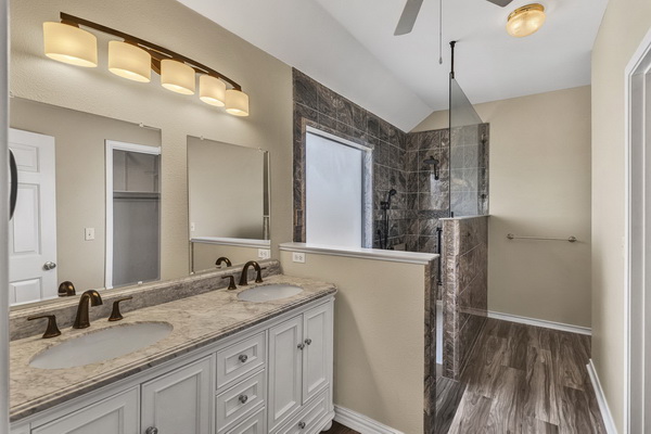 - Primary bathroom with dual sinks.