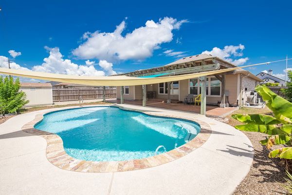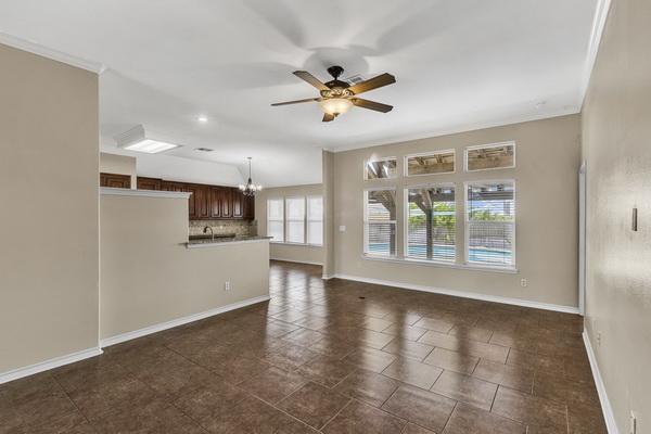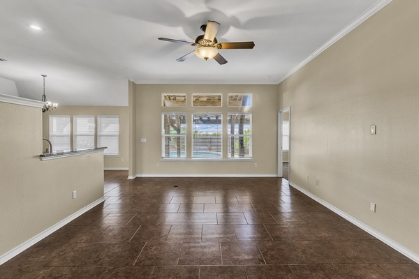 - Open living area with a view of the sparkling pool in the back yard.