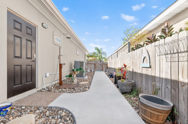 - Side yard w/ sidewalk and outdoor shower