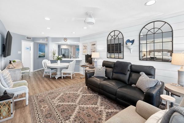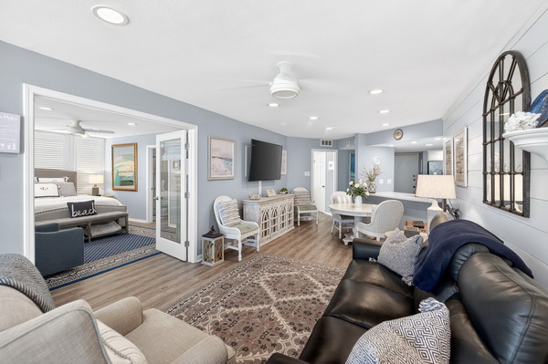 - Living area, plantation shutters – French glass doors into the primary bedroom.