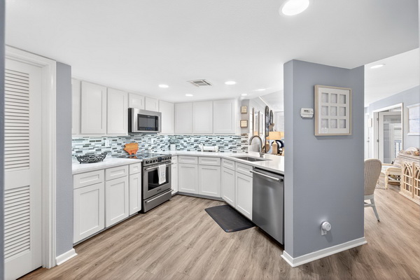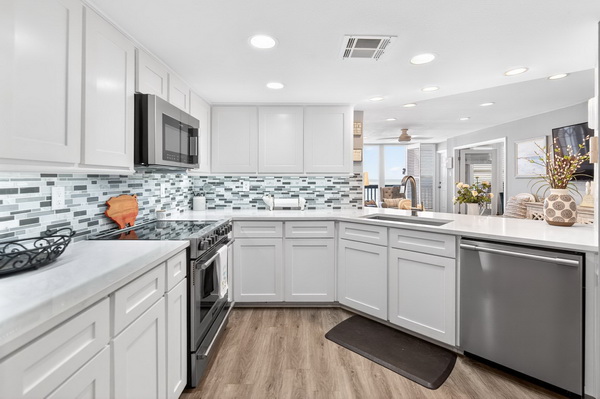 COME COAST AWHILE…And Wake Up to Breathtaking Gulf Sunrises in This Upgraded Portofino Corner Retreat! Beautifully updated and fully furnished (minus personal items), this 4th-floor corner condo at the beachfront Portofino complex delivers the lifestyle so many just dream of. Floor-to-ceiling windows wrap the living space in natural light, showcasing sweeping views of the heated pool, sandy shoreline, and the shimmering Gulf waters. Step onto your private balcony and enjoy sunrise colors that greet you each morning as you sip your cup of coffee. What a way to wake up! This 2BR/2BA condo has been thoughtfully transformed with new flooring, shiplap accents, plantation shutters, ceiling fans, and new 6-panel doors throughout. The kitchen shines with new counters, cabinetry facings, gorgeous backsplash, new sink & faucet, under-cabinet lighting, and higher-end appliances. The Gulf-facing bedroom features elegant glass French doors, fully renovated bath with large walk-in shower, updated cabinetry, fixtures, lighting and more. Every detail has been elevated for comfort, beauty, and ease. With Portofino’s beachfront setting, amenities and unmatched views, this turnkey condo is the coastal retreat you won’t want to miss. Come Coast Awhile….your Gulf-front lifestyle is waiting!
