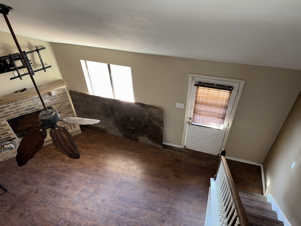 - Loft bedroom view to downstairs, with woodburning fireplace.