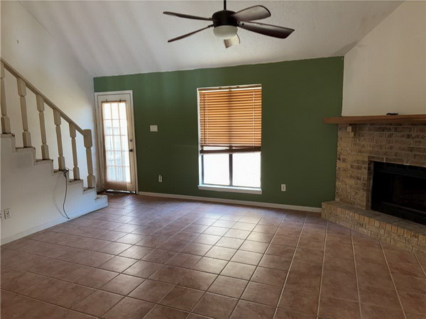 - Living area to back patio and stairs leading to loft bedroom.