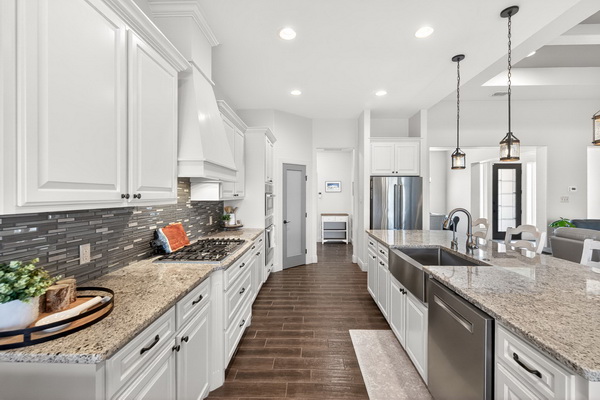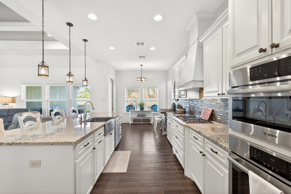 - Granite counters, gas stove top, sparkling stainless appliances.