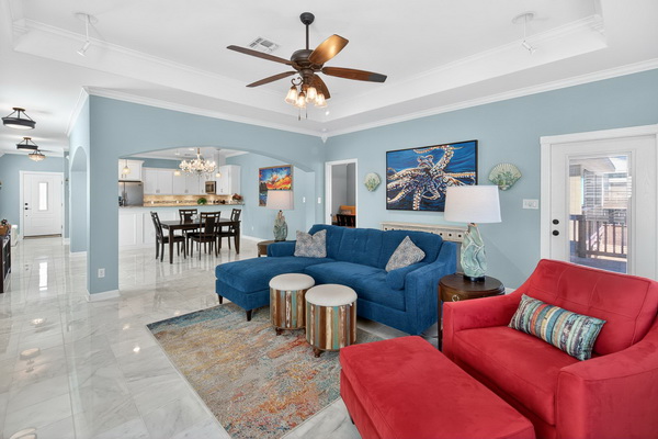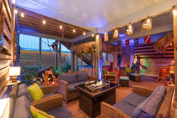 COASTAL PARADISE ON PARADISE POINTE DRIVE…Fully Furnished and full of charm, this Port Aransas retreat blends comfort, personality, and strong rental potential. STR’s (short term rentals) are allowed, making it an ideal turnkey investment or personal coastal escape. Inside, the home offers an inviting coastal layout with real marble flooring, Berber carpet in the bedrooms, and elegant framed plantation shutters in every room. Well-equipped kitchen provides tons of counter space, perfect for cooking and entertaining. The home includes 3-bedroms and 2 full-size bathrooms, highlighted by a large primary ensuite with jetted tub, separate shower, and a walk-in closet with passthrough to the laundry room. The primary bedroom also features a balcony with stairs leading directly to the first-floor living area. Two additional good-size bedrooms provide great guest space. A fun bonus is the Pirates of the Caribbean-themed first-floor living area, perfect for movie nights or entertaining. Outside, enjoy a private enclosed oasis with a hot tub under a palapa, outdoor tiki bar, built-in TV, BBQ area, propane fire pit table, wicker conversation set, and outdoor shower. The property also features an oversized single car garage plus extended carport, offering parking for up to six vehicles comfortably – a very rare perk in Port A. Offered fully furnished with a newer HVAC system, this fabulous well-maintained home is ready for immediate enjoyment or rental. Community pool & pond with fountain. Quick access to Port A beaches, dining, shopping, and fishing. Come Coast Awhile…right here!
