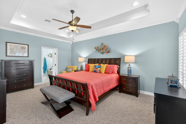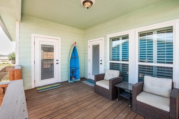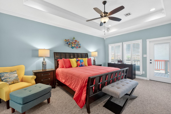 - Primary bedroom with door out to the upper deck with seating.
